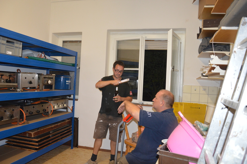 Unsere beiden eifrigen Hobbyheimwerker Hubert und Ralf haben sich am Montag gleich zum nächsten Einsatz getroffen. Das Abschrauben der alten Heizkörper von der Wand ging leichter als gedacht, mit dem richtigen Werkzeug allemal. Eine passende Berechnungsformel für die aufzubringende Energie haben sie auch gleich gefunden: "Kraft aus mindestens 100 kg Körpergewicht mal zwei Personen, geteilt durch drei bis fünf Barcadi ergibt einen durstigen Ralf."