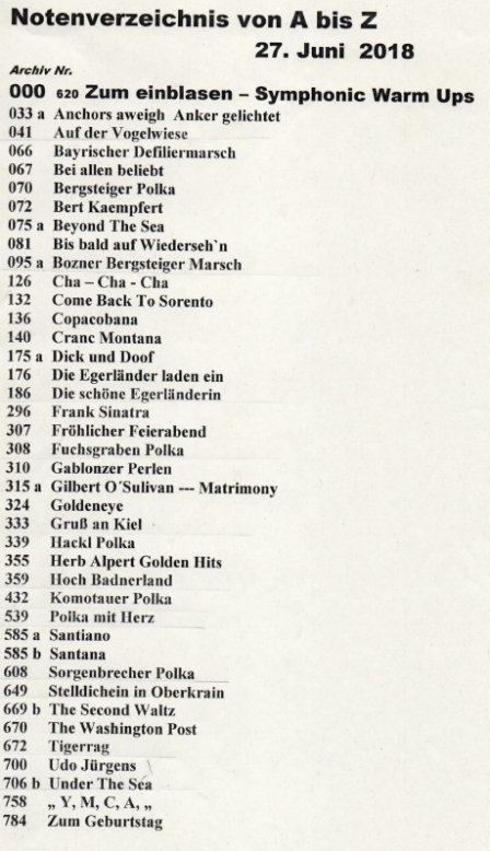 Auf dieser Seite finden Sie den Inhalt unserer aktuellen Mappe, d.h. die Stücke und Lieder, die wir bei Festauftritten und ähnlichen Gelegenheiten spielen. Außerdem können Interessierte Einblick in das Verzeichnis unseres Notenarchives nehmen.